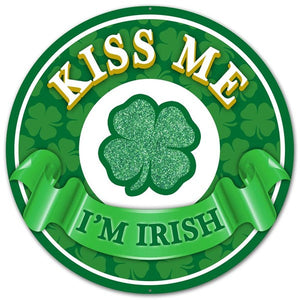 Kiss Me Irish Saint Patricks Day Metal Sign : Emerald Lime Green White - 12" Round