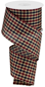 Primitive Gingham Check Wired Ribbon : Navy Blue, Burgundy Red, Tan Beige - 2.5 Inches x 10 Yards (30 Feet)