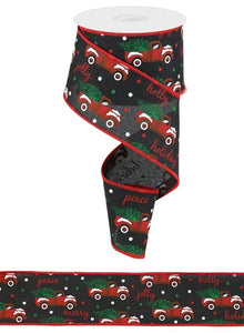 Christmas Farm Trucks Royal Wired Ribbon : Black, Red - 2.5 Inches x 10 Yards (30 Feet)