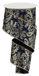 Christmas Bold Damask Faux Dupioni Canvas Wired Ribbon - 10 Yards (Navy Blue, Light Gold, 2.5 Inches)